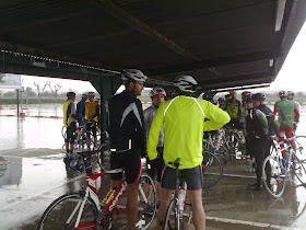 A la altura del Río Llobregat llueve de verdad. Paramos en el parking del centro comercial Carrefour Prat a esperar que el chaparrón que está cayendo pare, pero una hora más tarde estamos igual. Hacemos tan mala pinta que hasta la policía viene a ver que hacemos escondidos en el parking. No nos dicen nada. Deben pensar que hay que ser idiota para salir en bici bajo una lluvia tan intensa.